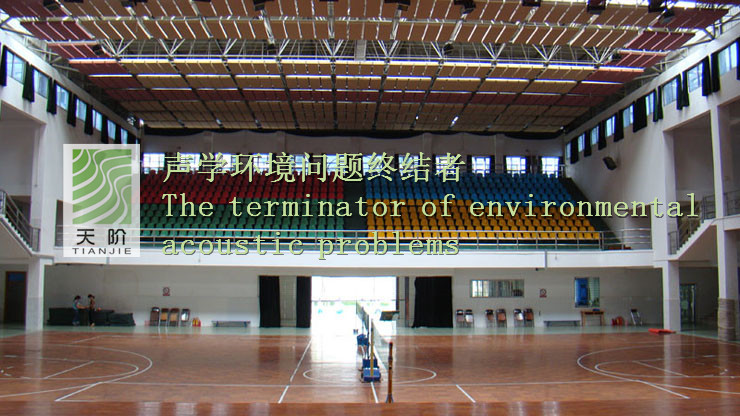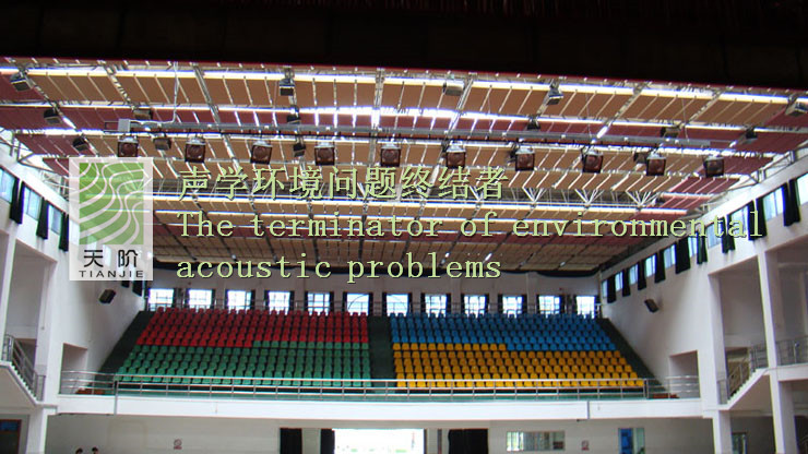 東莞中學(xué)體育館采用的是空間吸聲體??臻g吸聲體是一種懸掛在頂棚具有高效吸收性能的吸聲材料??臻g吸聲體一般水平或者垂直吊掛。空間吸聲體面積占頂棚面積30%-40%時(shí)其材料的吸聲性能是其他聲學(xué)材料吸聲性能的2倍。