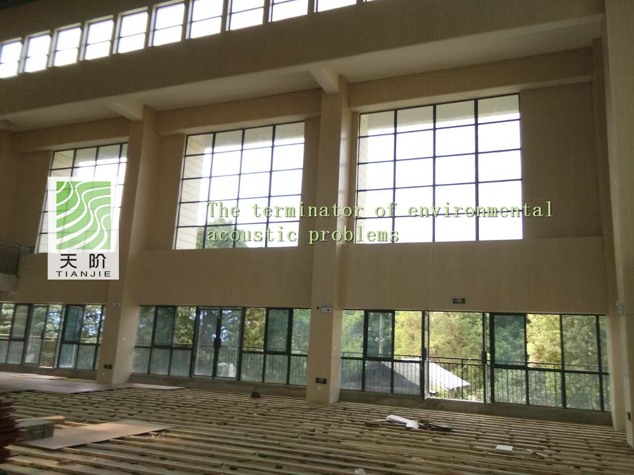 找了聲學(xué)專家對(duì)籃球館進(jìn)行了聲學(xué)設(shè)計(jì),采用了槽木吸音板。