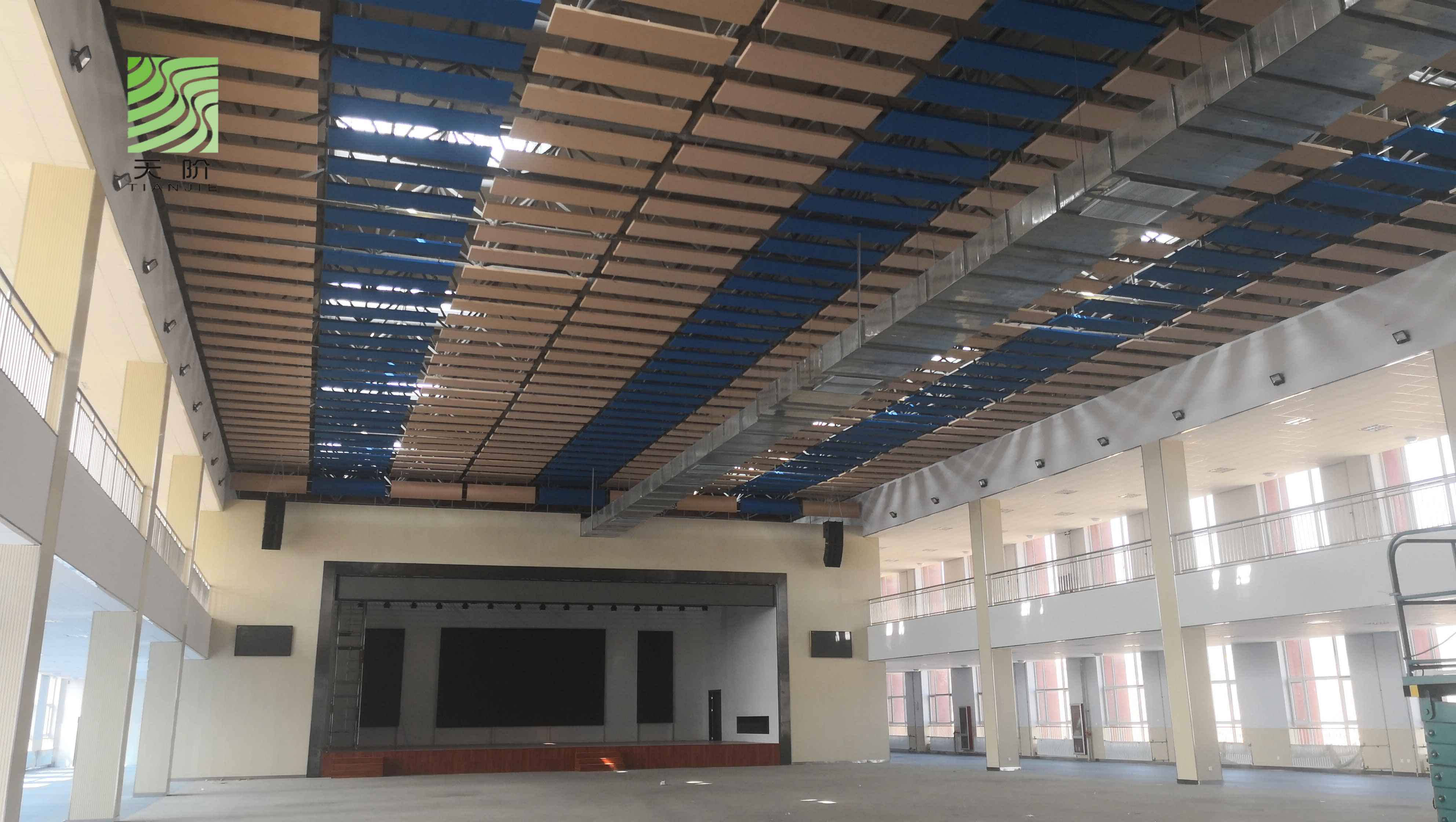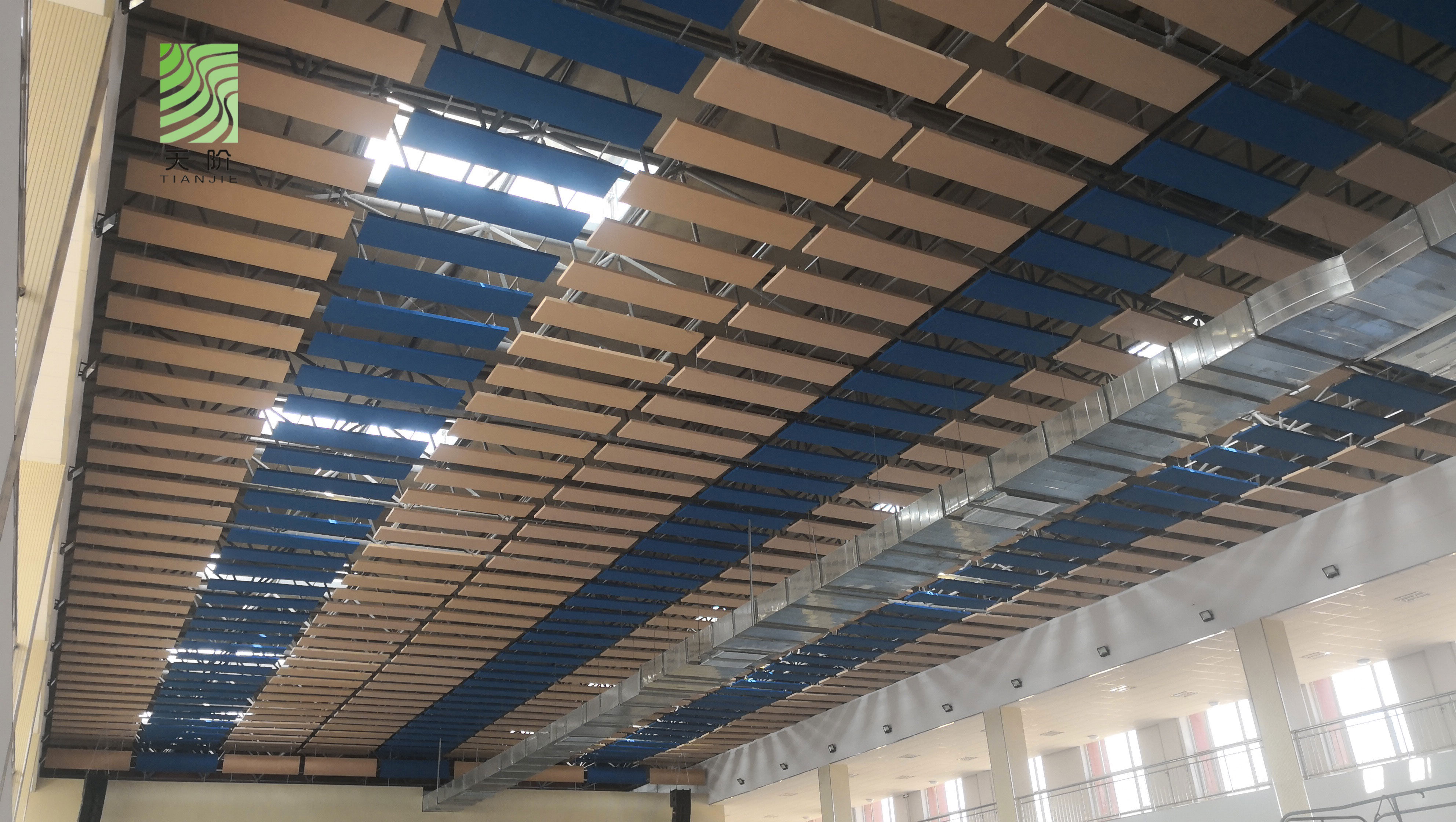 ⒌近年較常見的做法是采用事先經(jīng)過測(cè)試的空間吸聲體(預(yù)制件),順著網(wǎng)架的形狀吊掛于棚頂??梢赃_(dá)到比較良好且較精確的吸聲效果。類似方法曾用于廣東中山古鎮(zhèn)體育館、肇慶學(xué)院體育館等場(chǎng)館,效果良好。這個(gè)方案不會(huì)過分影響建筑風(fēng)格,如果對(duì)空間吸聲體的造型和色彩適當(dāng)組合搭配,還會(huì)有一定的美化效果。