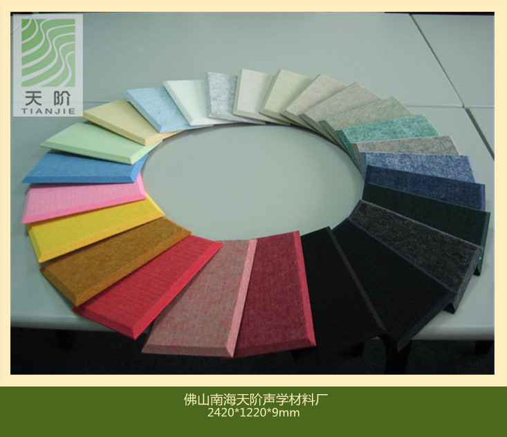聚酯纖維吸音板、柔韌性聚酯纖維吸音板和彩色聚酯纖維吸音板三種,其中不同的聚酯纖維都有其不同的用途,更顯聚酯纖維的專業性。目前我們用的比較多的是通用型與柔韌性聚酯纖維為主,而彩色的聚酯纖維吸音板處于高速發展的階段,產品還處于考察的階段,其公眾認可對還需要較長的一段時間來檢驗。