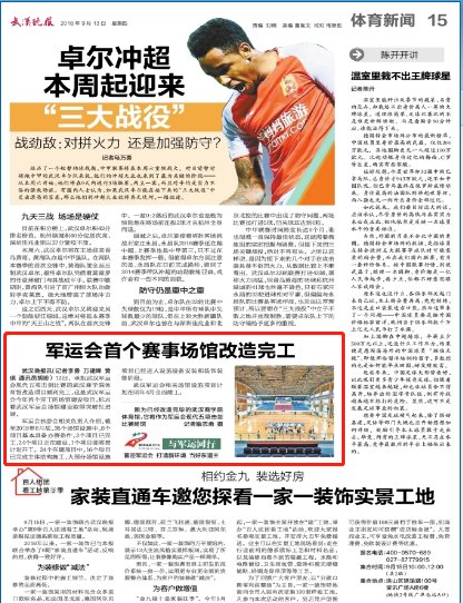 武漢軍運(yùn)會(huì)相關(guān)場(chǎng)館設(shè)施項(xiàng)目計(jì)劃在明年4月全面竣工。