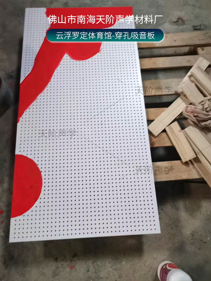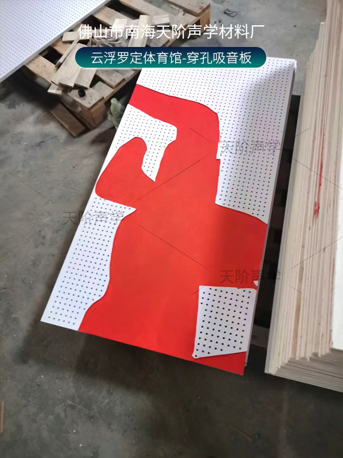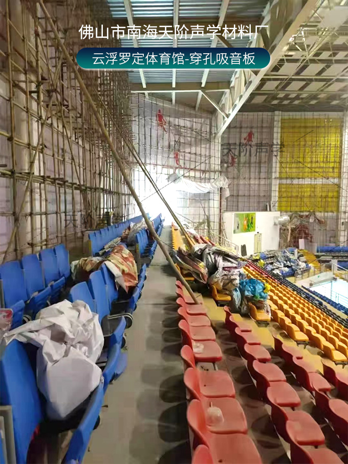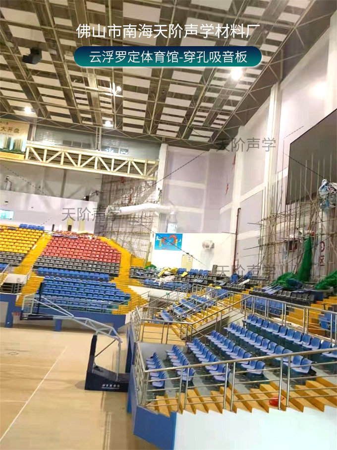 云浮羅定體育場(chǎng)項(xiàng)目改造中,使用平板吊頂空間吸聲體用頂部吸音裝飾;墻面選用白色飾面的穿孔吸音板,基材選用不燃的玻鎂基材,運(yùn)動(dòng)造型的穿孔設(shè)計(jì),活力動(dòng)感,有出色的降噪效果。