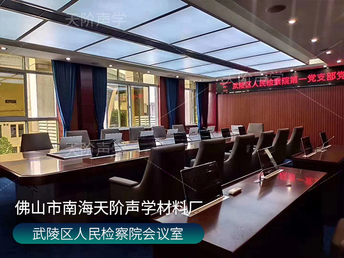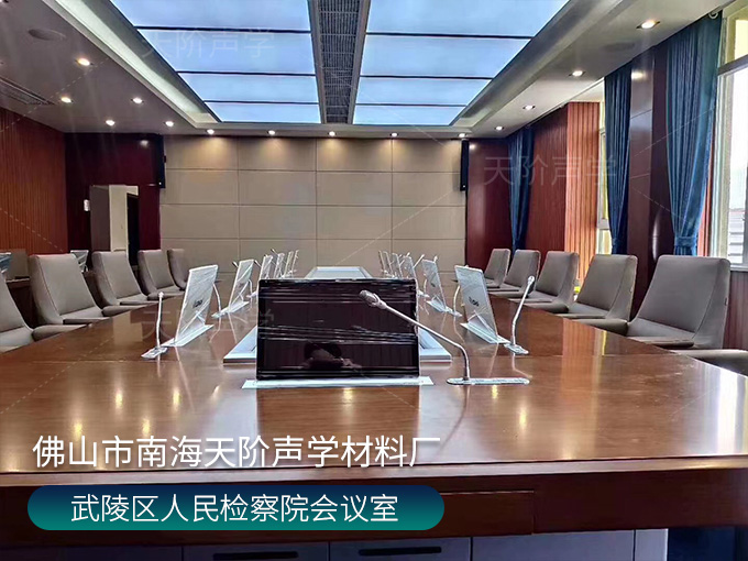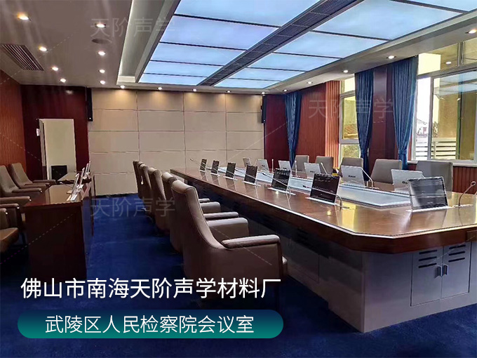 武陵區(qū)人民檢察院會(huì)議室,墻面使用槽木吸音板,選用不燃陶鋁板基材;加入軟包吸音板,高雅又有格調(diào),消除回音和雜音。