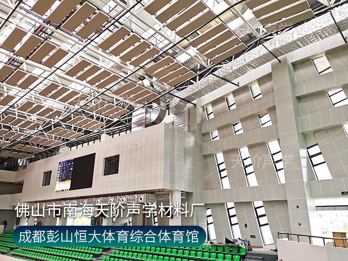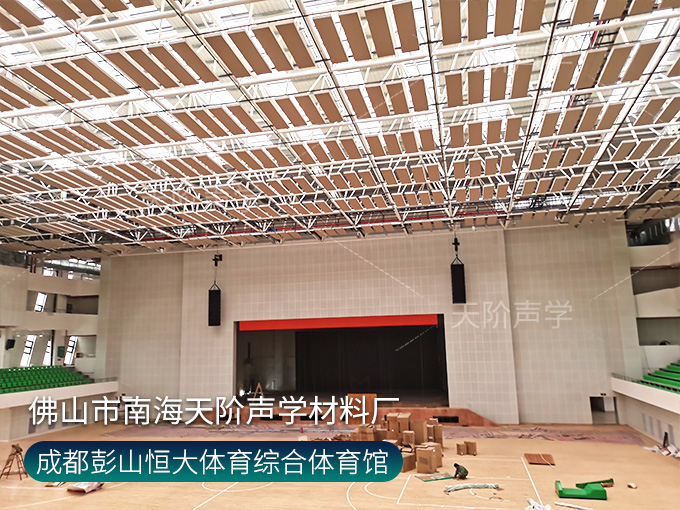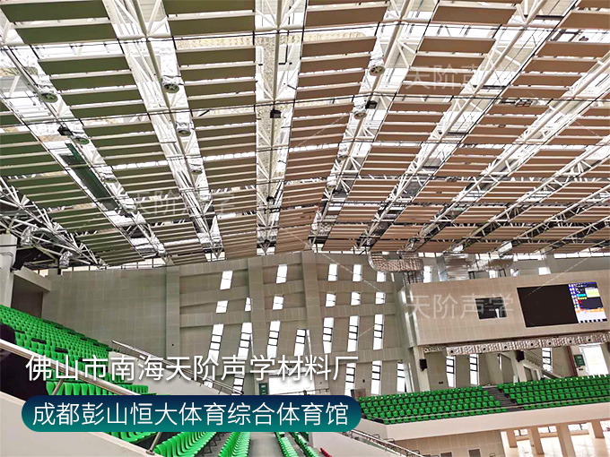 成都彭山恒大體育綜合體育館項目,墻面使用槽木吸音板,基材選用不燃堅硬的玻鎂基材,飾面選用活力青春的色調(diào)。條形開槽吸音板,吸音效果顯著,能吸收活動期間的噪音,回聲。