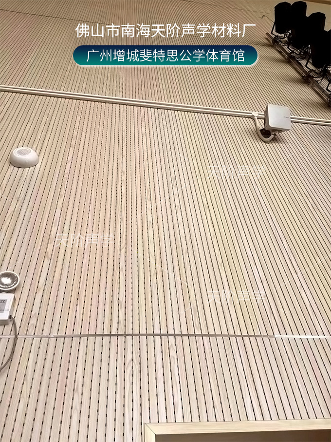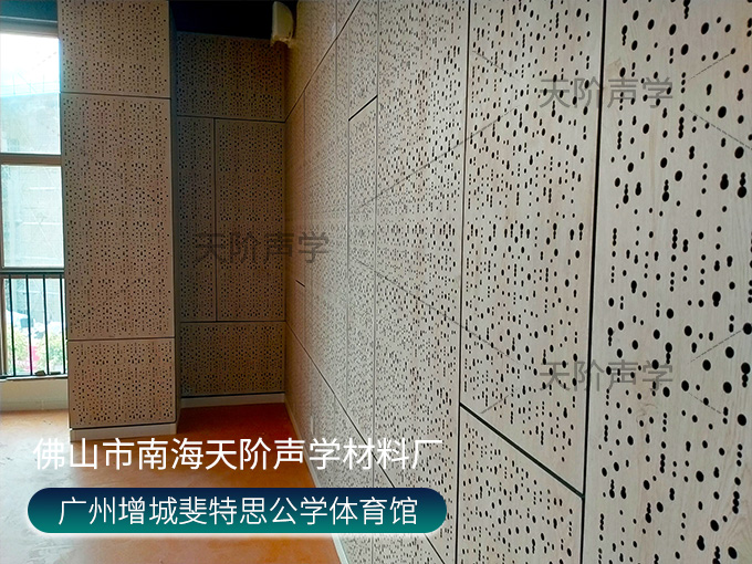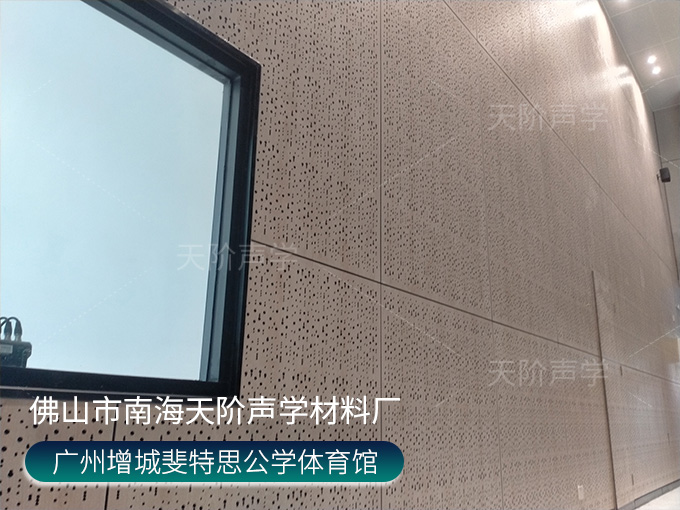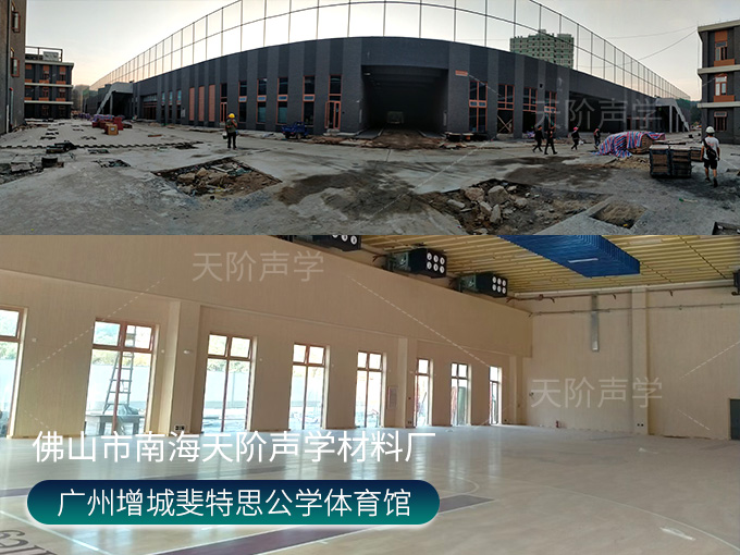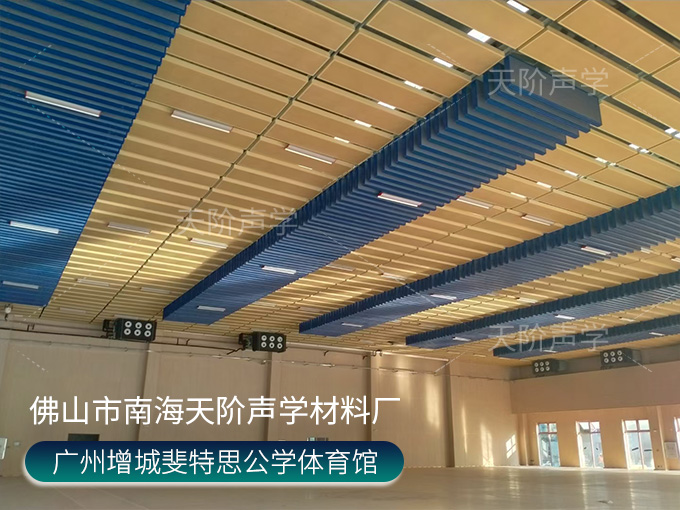 廣州增城斐特思公學(xué)項目,體育館選用天花吊頂平板空間吸聲體,色彩使用活力動感的黃色+藍(lán)色搭配,時尚又美觀;多功能禮堂,選用高端定制穿孔吸音板,吸音降噪。