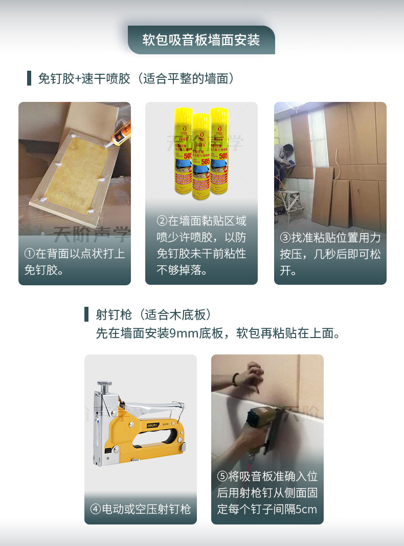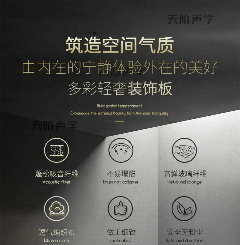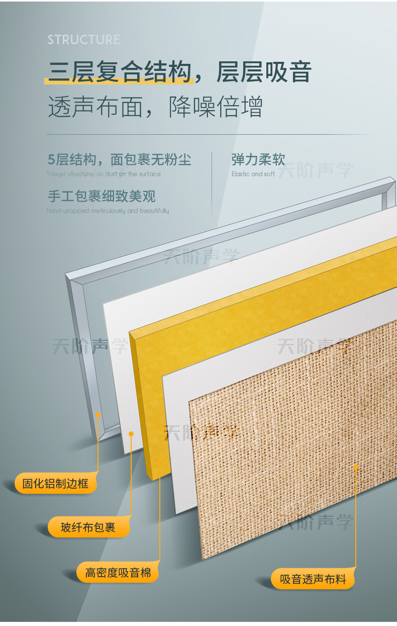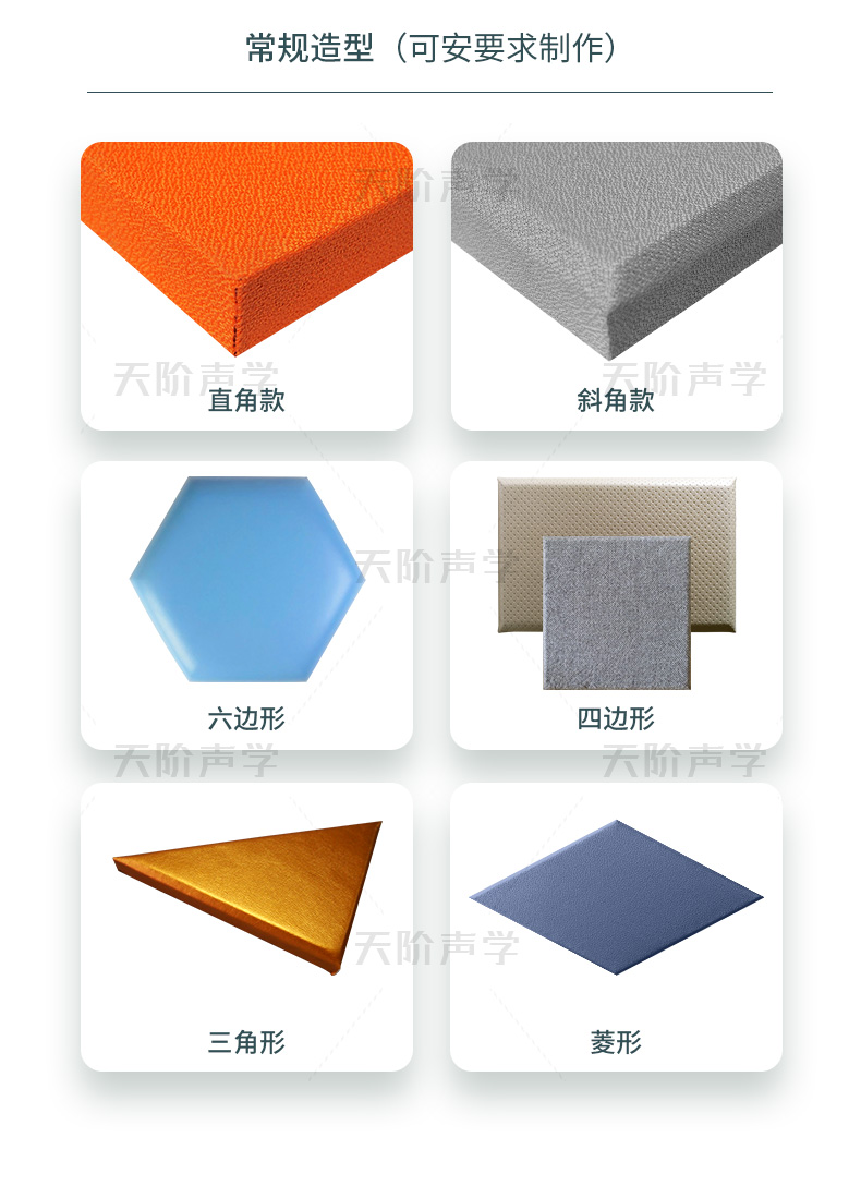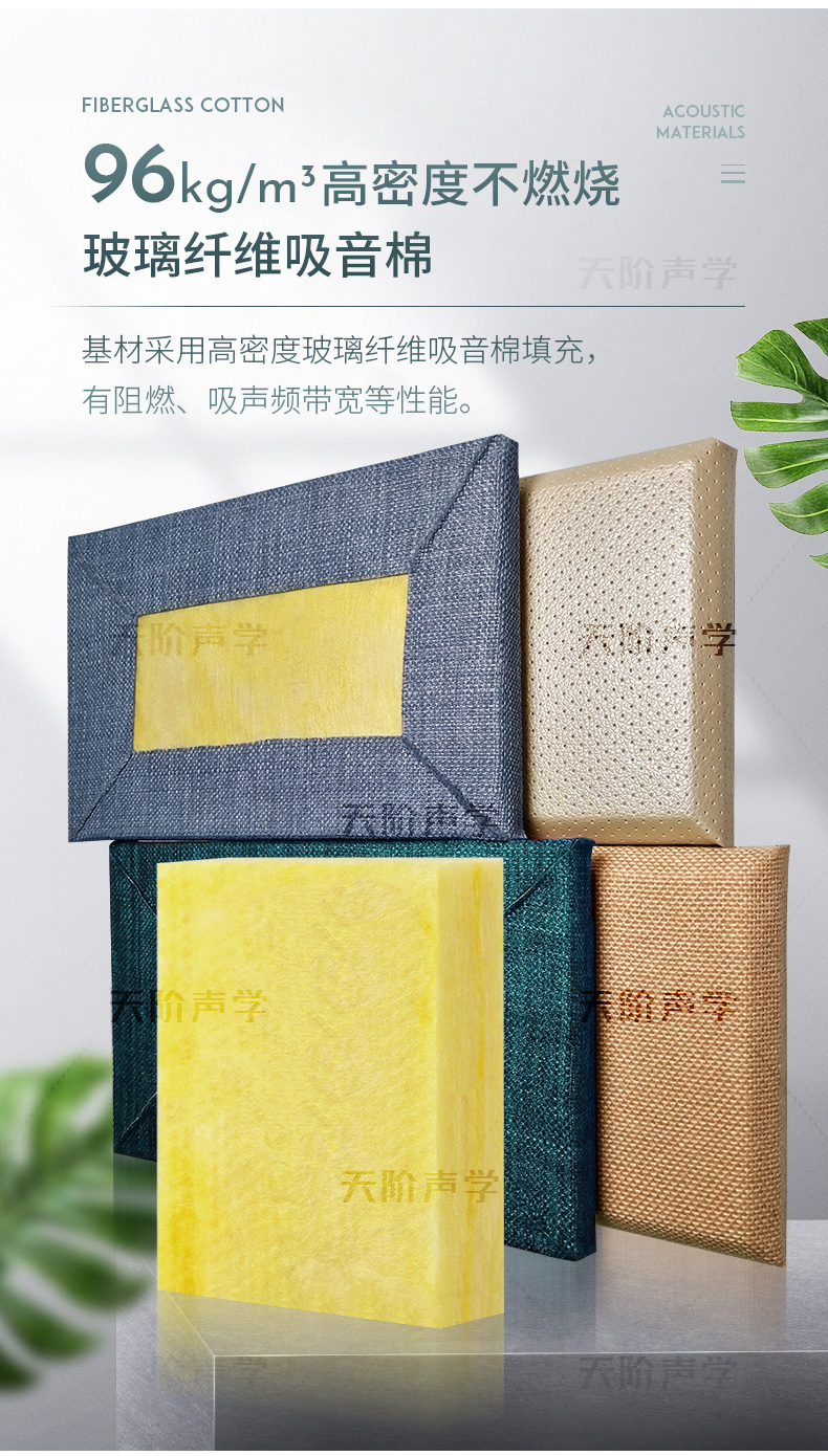 天階聲學布藝吸聲板采用高質的96kg/m3玻璃吸音棉。具有環保、阻燃、吸聲頻帶寬、裝飾性強、施工簡單、無粉塵污染等性能,飾面顏色及材料選擇性廣,能很好地滿足客戶多樣化的聲學及裝飾需求。