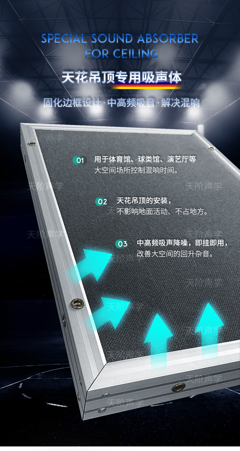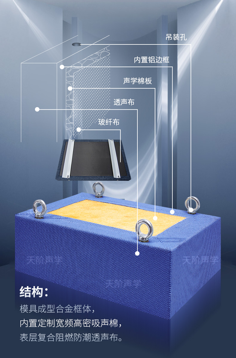 一種分散懸掛于建筑空間上部,用以降低室內噪聲或改善室內音質的吸聲構件。空間吸聲體具有用料少、重量輕、投資省、吸聲效率高、布置靈活、施工方便的特點。許多國家從