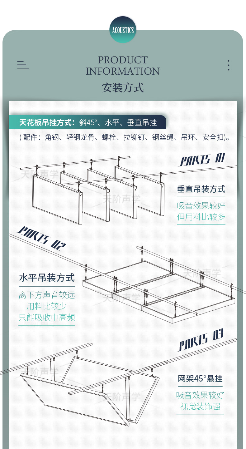 空間吸聲體大多懸掛于建筑物空間的頂部,且以離頂吊掛居多。板狀空間吸聲體可以水平分散吊掛,也可垂直分散吊掛,還可水平、垂直復合吊掛,在總面積相同情況下,降噪效