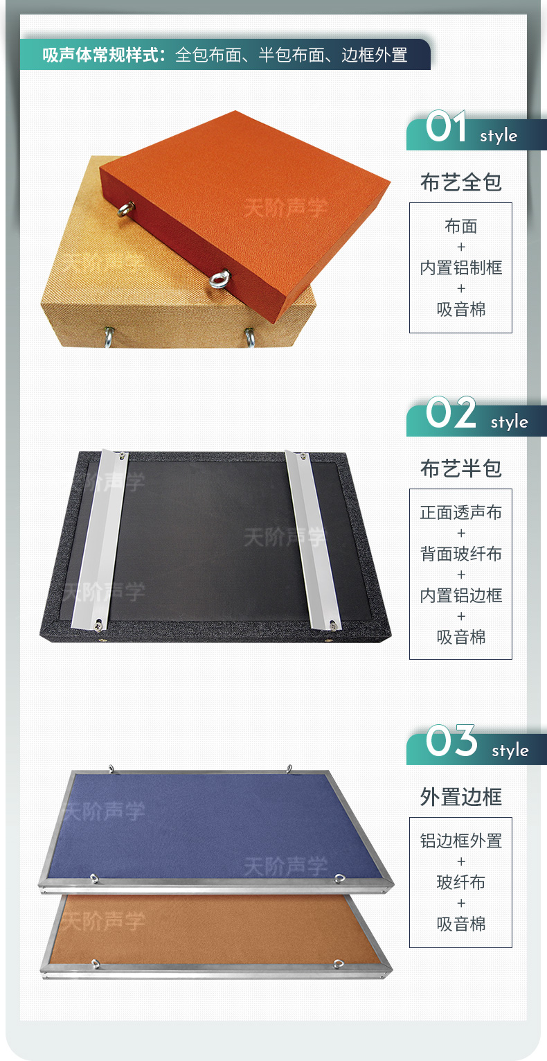 常見的空間吸聲體由骨架、護面層和吸聲填料構成。材料的選擇應視空間吸聲體的大小、剛度和裝修要求而定。骨架可采用木材、角鋼、薄壁型鋼等。護面層可采用塑料窗紗、塑