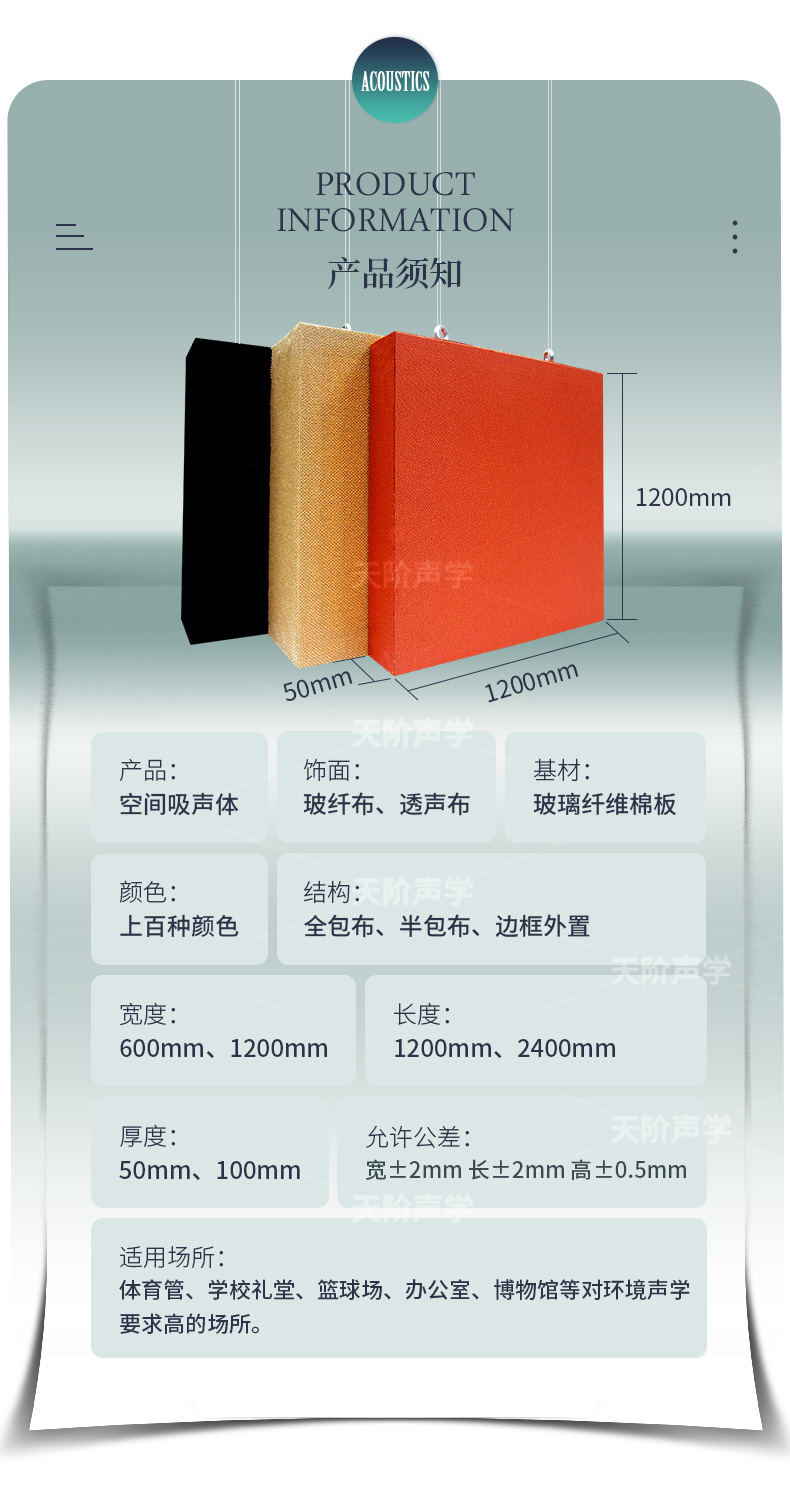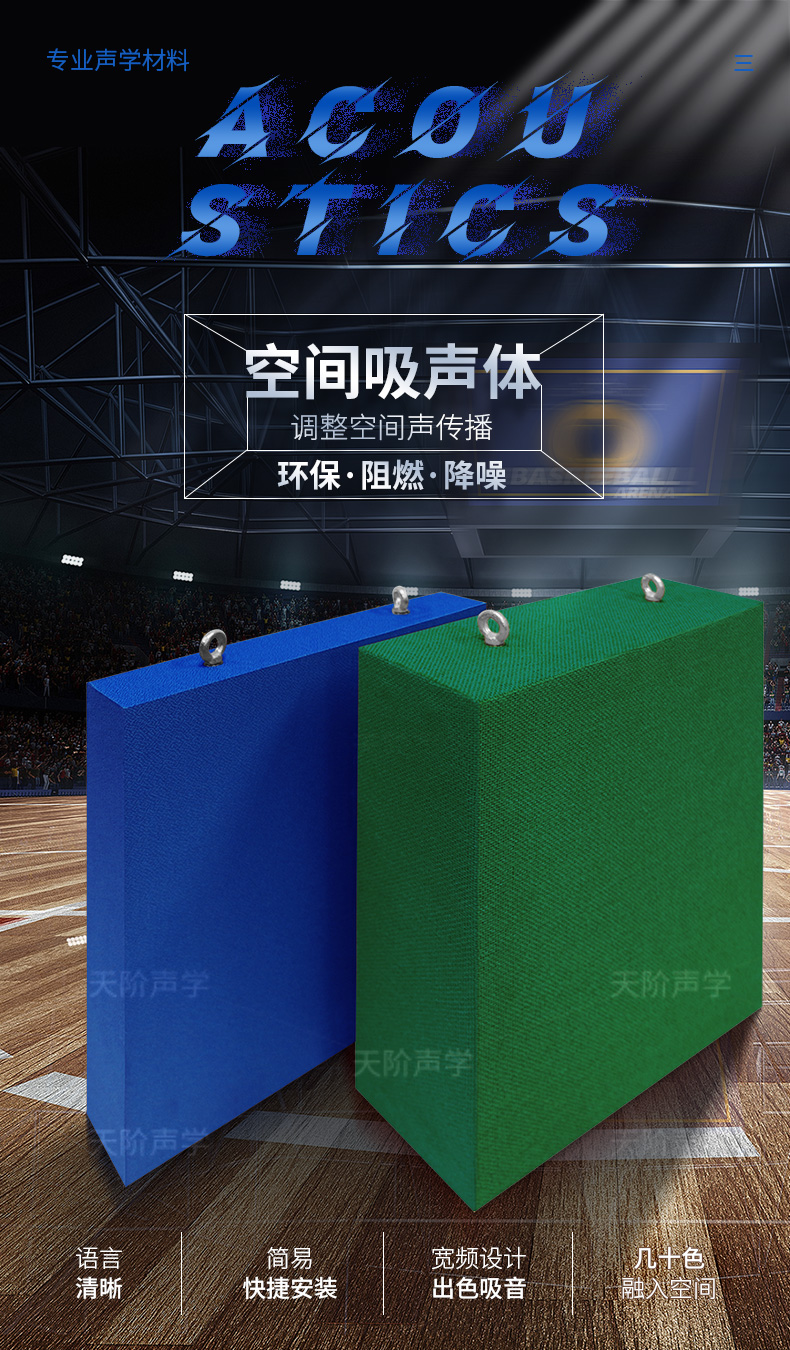飾要求和聲源特性,可有板狀、方塊狀、柱體狀、圓錐狀和球體狀等多種形狀。其中板狀的結構最簡單,應用最普遍。空間吸聲體多用于室內體育館,其各式各樣的形狀、擺設方